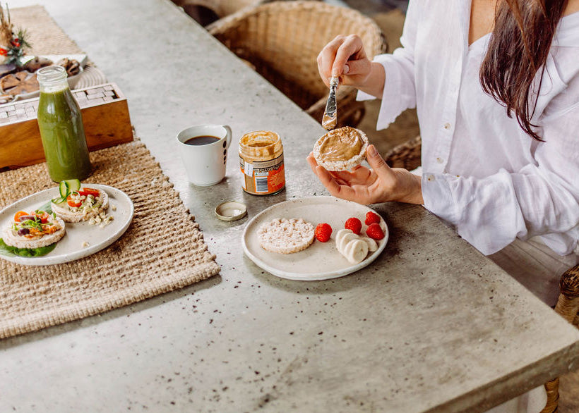 - Spread almond butter and sliced banana on our buckwheat cakes
